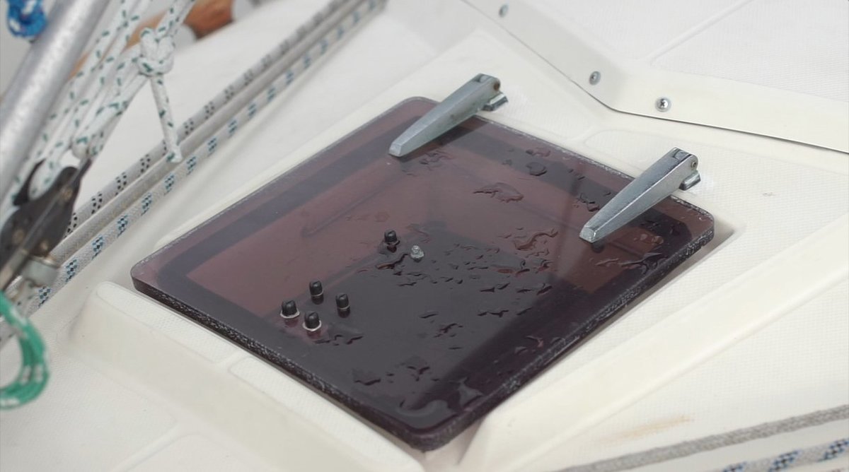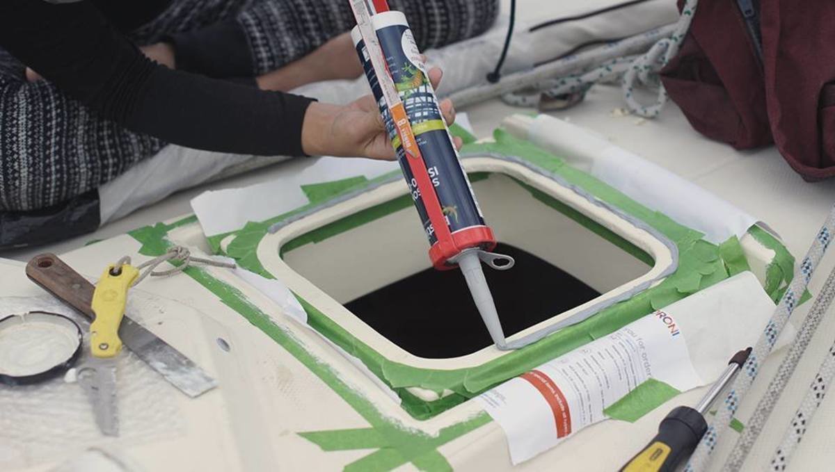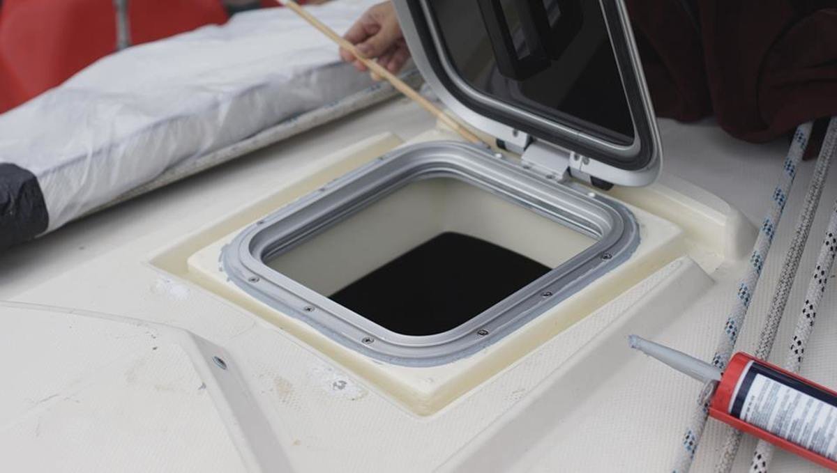 Then, we marked up holes for our new hatch onto our shiny new base, where the window was going to go, and drilled holes into it. We scuffed the surface of the base lightly, then added some spacers all around, solidified with contact glue. The spacers will ensure an even thickness of sealant all around, between the hatch and the base. Once dry, we applied a sealant, grey stuff, that ensures aluminum to fibreglass adhesion. Then, we pressed the window onto it, and put the screws in. We added more sealant around the edges, tooling it in for a clean finish, soapy water at hand, and did the same inside.
