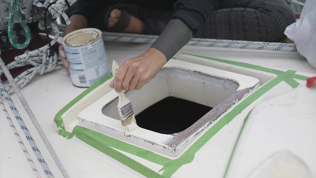 We painted the entire frame, to a color approximating that of our boat, except that it had a subtle yellow tint. We also epoxied and painted the area inside the cabin, making for a smooth transition.