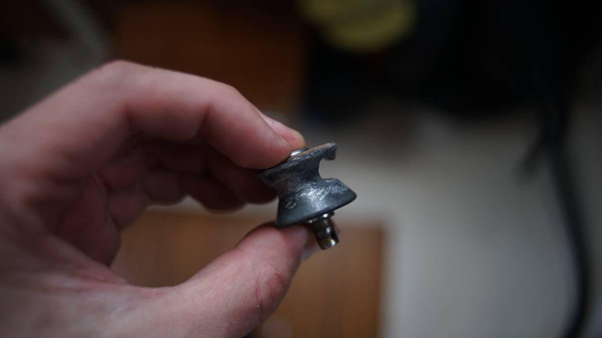 The issue with replacing the intermediate shrouds though, was that the T-terminals they had were too big to fit in the backing plates of our mast. A t-terminal is a piece at the top or end of the wire, shaped like a T (as the name suggests), that fits into a backing plate that is attached in your mast with rivets (a permanent mechanical fastener). The backing plate is in a hole, in your mast, and has a little elongated slot for the T to fit into, it fits at an angle and when turned the little arms of the T keep it in place.