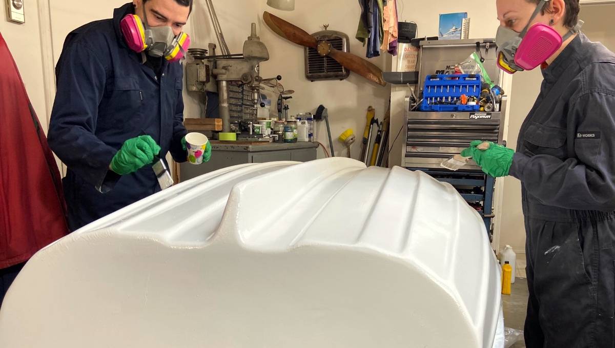 After removing all of the paint, we cleaned most of the dust off with a wet rag, let it dry, then removed the remaining dust with some acetone. When the dinghy was clean, we moved it inside the workshop to start on the gelcoat.