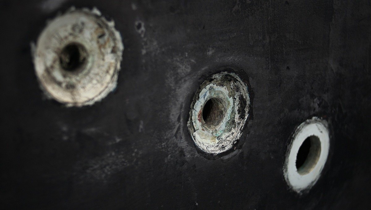Pino's hull is thick fibreglass, thicker on the floor behind the keel (where the galley thru-hulls are located). We closed the macerator hole first as practice, then we moved on to close the other 3 in the head in one go.