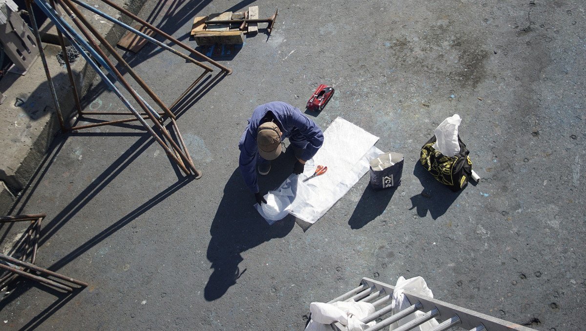 We also covered the boat with plastic sheeting from the waterline down to keep fibreglass dust from blowing around the boatyard. The boatyard is right near a bird sanctuary (poor choice of location), the last thing we want is to blow dust around where they eat.