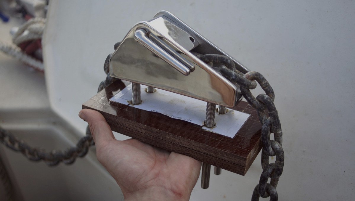 Voila, we now have a chain stopper on deck! We added sealant under the G-10 and painted over it. We also added a metal corner on the forward edge, to protect the base from chafe from the chain.