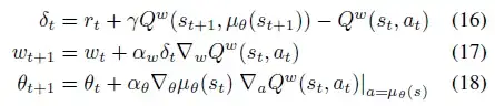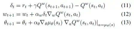 I only noticed that the equation 11 and 16 are different, and the difference is the action part of Q function where is $a_{t+1}$ in equation 11 and $\mu(s_{t+1})$ in equation 16. If that's what really matters, how can I calculate $a_{t+1}$ in equation 11?