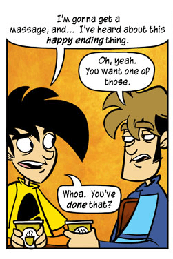 The best way for an honest citizen who really needs a massage to get one without the sex getting in the way, by the way, is to look for a registered massage therapist rather than some random parlor. If you just go to some random place, it's probably going to be one of these; they're surprisingly common. If you do wander in to the wrong type, keep in mind that there is nothing wrong with just saying, "No, thank you" to whatever is on offer.