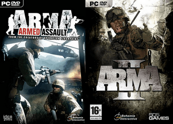Czech game developer Bohemia Interactive Studios' Spiritual Successor to their successful and legendary Operation Flashpoint series. Unlike the original, these installments take place in Present Day and Next Sunday A.D. time frames, not the Cold War. The basic premise and game design philosophy of making a well-researched, true-to-life and unrelentingly realistic simulation of everyday military life is still there though. As is the practice of using various fairly funny (and Reference Overdosed) Ruritanias as the setting for the games' campaigns and missions.