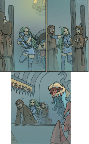 - Inverted in the Discworld novel Soul Music, where the Band with Rocks In is seemingly about to get eaten in the sinister town of Scrote, but avoids this fate by performing a rock concert.