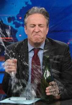 - Happened on The Daily Show, as pictured above. The trope was quickly exaggerated, as Jon would first break the glass, then the bottle, then a "comedically placed" aquarium.