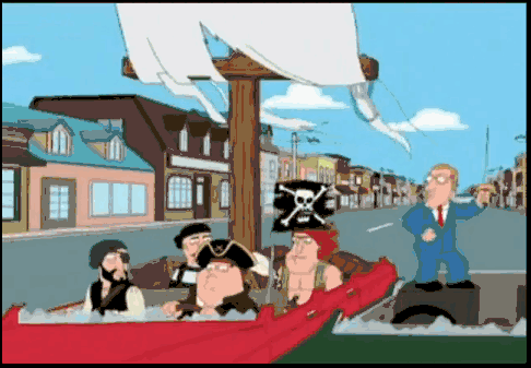 - Played for Laughs in a Family Guy episode when Peter goes from stealing a parrot as a pet from a veterinarian's office, to dressing as a stereotypical pirate, then hiring a pirate crew and finally going on the road and engaging a motorist in an epic swashbuckling fight, in the course of which Peter's car acquires a mast and sails.