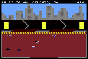 - In-Universe Game Clock: The game has a night and day cycle that was quite advanced for its time. Time moved at the speed of real life, but sped up considerably (as in, an hour per second) while riding a train from one location to another. For every two hours in the game, there's a different color for the sky, buildings, and the windows in the buildings may be lit up or not, providing twelve distinct times of day. Also, the trains run on a schedule, with a new train coming every 15, 30, or 45 seconds.