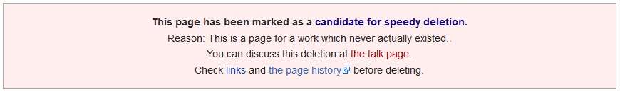 Adding a delete template to a page has two important effects. First, it puts a large notice about the requested deletion on the page. The example above would display as: