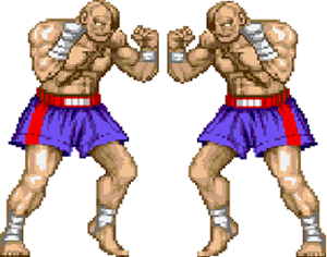 - Gill from Street Fighter III was designed specifically to show that the CP System III (the arcade hardware the game was originally released on) could be used to avert this problem. The red half of his body always faces to the left of the screen, and the blue half always faces to the right, no matter which direction he turns. His special attacks even change depending on which way he's facing. His secretary who shows up in his win poses has an asymmetrical haircut for this reason as well.