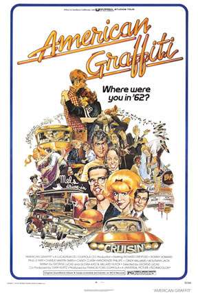 American Graffiti is a 1973 Coming of Age film based on director George Lucas' memories of growing up in The Fifties (actually the very early Sixties, which had much more in common with The Fifties than The Sixties) and he thus manages to cram in as much Popular History as possible. Of course, he was one of the first to do this. The film was produced by Lucas's friend and fellow filmmaker Francis Ford Coppola, who was just coming off his success with directing The Godfather. It follows a bunch of High School kids as they spend the night after their graduation goofing around, getting into trouble and contemplating their futures all while listening to Nothing but Hits. No, there really is no plot. Get over it.