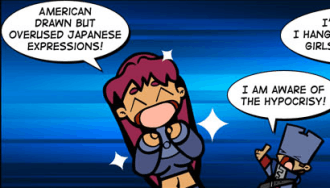 - El Goonish Shive is not all-out animesque, but remembers its roots and waves to them, often using Anime/Manga tropes (and character types). As an excuse to occasionally have fun with the ones use of which is harder to justify (like Calling Your Attacks), EGS also got "Anime Style Martial Arts" and a Japanese family from early on.