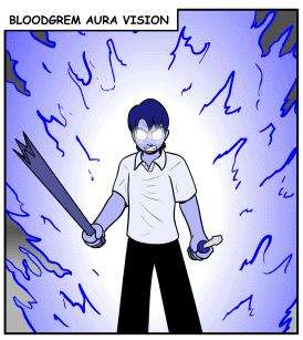 - El Goonish Shive in this installment: a Bloodgrem (summoned specifically because it can discern auras) gets a good look at Elliot's power level.
