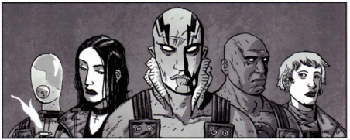From left to right: Johann Kraus, Liz Sherman, Abe Sapien, Roger, Kate Corrigan. Not pictured: Captain Benjamin Daimio.
