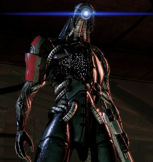 - Legion (the image above and inspiration for this trope) and EDI in Mass Effect 2.