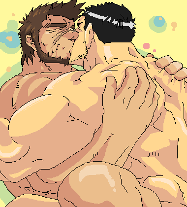Bara is a genre of manga and art made by gay and bisexual men, for gay and bisexual men. In Japan it's more commonly known as "gei comi", "gei manga", or "menslove". Bara generally features mature and realistic(ish) relationships, rather than overly melodramatic soap opera plots. Bara plots tend to be simple, short, and to cut to the chase, If You Know What I Mean. Since All Men Are Perverts (doubly so if they're gay) plays it hard here, bara is almost always very explicit, to the point that "Bara Hentai" is a redundant phrase. Another important characteristic is that bara emphasizes manly and muscular (sometimes hairy) characters with varying degrees of body fat, as opposed to the androgynous and effeminate boys commonly found in Yaoi. It also, usually, tends to avert, subvert or invert the Uke and Seme dynamics eg. most of the time the Seme is someone younger and much more "cuter" looking.