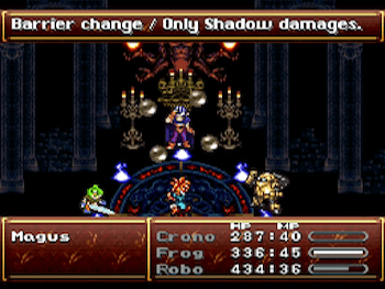 - The Trope Namer is the move Barrier Change used by Magus in Chrono Trigger. This fight is the most famous example of this trope. Magus was in fact healed by Elemental Powers which did not match the element of his barrier, and changing his barrier also inflicted high elemental damage to your entire party.