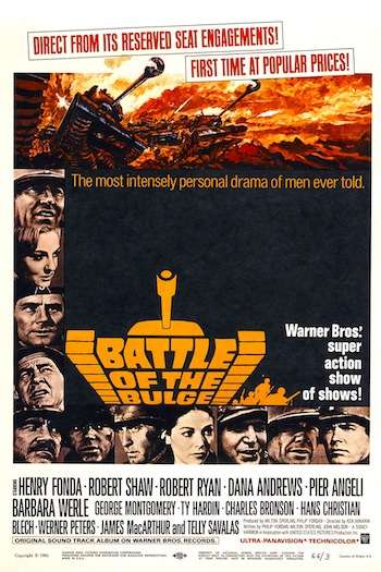 Battle of the Bulge is a 1965 war movie about the famous World War II battle of the same name, starring Henry Fonda as a maverick American intelligence officer and Robert Shaw as his ruthless Nazi opponent. Also stars Charles Bronson, Telly Savalas, and Robert Ryan. The feature was filmed in Ultra Panavision 70 and exhibited in 70 mm Cinerama. Unlike most World War II epics, "Battle of the Bulge" contains virtually no portrayals of actual senior Allied leaders, civilian or military. This is presumably because of controversies surrounding the battle, both during the war and after. Though Allied forces ultimately won the battle, the initial Nazi counteroffensive caught them by surprise and caused high casualties. Frequently broadcast on American television in The Seventies. The film itself is completely made up, and doesn't match any of the actual Battle of the Bulge in Dec 1944 though Jan 1945, with the sole exception of the Malmedy Massacre.