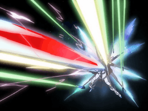 - The Freedom Gundam in Gundam SEED and its upgrade, the Strike Freedom, in Gundam SEED Destiny, especially when equipped with the METEOR pack. Combine near-limitless energy with a state-of-the-art targeting system (two luxuries that most mobile suits in the SEED universe don't have) with a SEED Mode user who refuses to kill and you get someone who can show up in the middle of battle and proceed to completely disarm both sides in less than a minute. Seriously, Kira Yamato's Fan Nickname could just as easily be Aimbot McBeamSpam. In addition, the Providence and Legend Gundams are capable of remotely-controlled Beam Spam thanks to their DRAGOONs, which the Strike Freedom is also equipped with.
