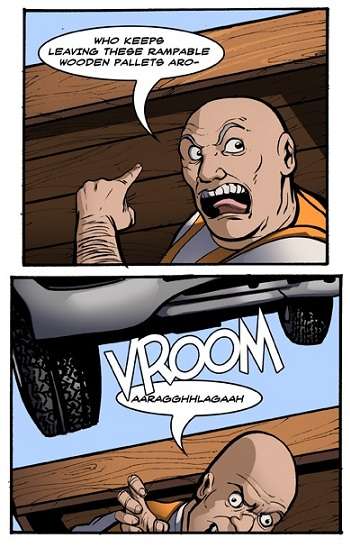 - Lampshaded brilliantly in The Adventures of Dr. McNinja (as seen in the page image)here, where a foreman yells about people leaving rampable wooden pallets around.