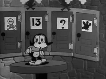 - Lawyer-Friendly Cameo: The mouse that puts a lock over the manhole that Bimbo falls into looks suspiciously like a more famous mouse who was just becoming popular at the time...