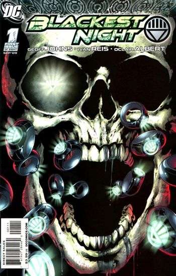 Blackest Night is the big Crisis Crossover event for the DC Universe in 2009, written by Geoff Johns, intended to take a serious look at death in comics. It's a gigantic Zombie Apocalypse featuring superheroes and supervillains being forced to fight against their loved ones risen from the grave. This involves plenty of Nightmare Fuel and crowning moments of awesome for everybody involved. The whole series is a detailed examination on what the Comic Book Death actually means for the character involved, mixed with a nonstop intense thrill ride of action and kickass personal battles, fueled by a cosmic terror.