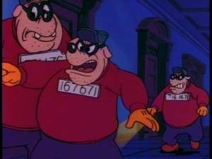 - The Beagle Boys from Disney wear their prison numbers all the time. There is also a running joke about how they never take off their Domino Masks. The Beagle Boys don't even have actual names, they're only known by their prison numbers. They wear red shirts, though, not the typical white and black striped prison uniform, although they do have the flatcaps.