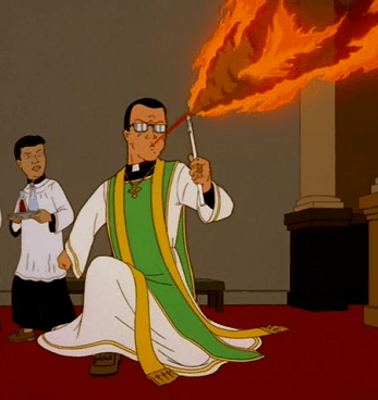 - Pictured above, Monsignor Martinez does this with communion wine. As pointed out above, this should not be a strong enough alcohol to produce the effect, but oh well.