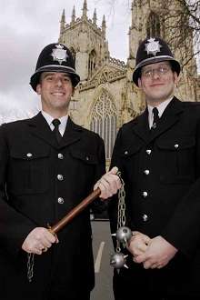 The British police are known for their distinctive helmets (worn outside Scotland when uniform officers are on foot patrol), properly called "custodian helmets" and giving rise to the derogatory term "tithead". These are only worn by men (women wear a different sort of hat) and are good for, among other things, covering up a naked man's offensive bits. Some forces have replaced them with a more modern design for routine patrols, but they are still seen on ceremonial occasions such as Remembrance Day parades.