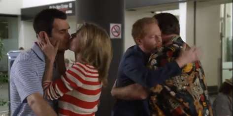 - Modern Family was criticized by many when gay couple Mitchell and Cameron (pictured above) hugged each other after a reunion at an airport, in stark contrast to straight couple Phil and Claire. Of course, some noted that none of the couples seem overly affectionate with each other but this was a big sticking point. In the second season, it's revealed that Mitchell is adverse to being affectionate in public. They finally do kiss, but it's a small peck discreetly played on the background, and they kiss again in the next episode in a way more visible and casual scene.