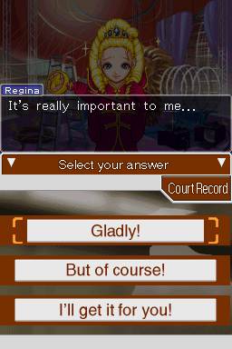 - Parodied in Phoenix Wright Ace Attorney: Justice For All. In case 3, when the painfully cute Regina Berry asks Phoenix for a favor, all the responses are basically "yes", and regardless of which one you choose, Phoenix will say to himself that he just can't say no to a girl like Regina.