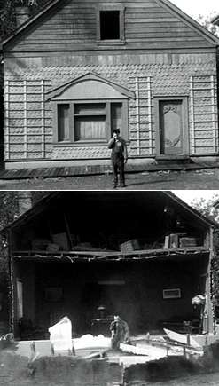 - Trope Codifier: Buster Keaton in Steamboat Bill, Jr. Keaton's stunt was noted for being done without any trickery (and for being botched by the crew at one point—they measured it wrong and missed flattening Keaton's skull by mere inches). The page picture is the end result. It's reported that both the cameraman and director were too scared to watch when the stunt was preformed.