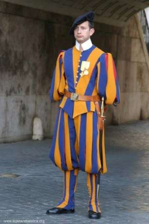 - Possibly the Western Trope Codifier: The Swiss Guards which protect the Pope. The silly pants may make them seem a little like Bunny Ears Lawyers, but they were a terror on the battlefield in the late 1400s to early 1500s, and retain their tradition faithfully. And while they look silly, anyone trying to do harm to His Holiness will come to realize, to their detriment, that they are highly trained military professionals—they have all completed basic training with the Swiss Army, are chosen according to exacting standards of physical fitness, and are given further training once they arrive in the Guards. And although they are most often seen with their ceremonial weapons (swords and halberds) for guard duty, this is in reality their version of the 18th-century uniforms worn by the British Royal Guards; when actually guarding the Pope, they carry the standard-issue weapons of the Swiss Army: the SIG Sauer P220 handgun, the SIG SG 550 assault rifle, and the MP5 submachine gun.
