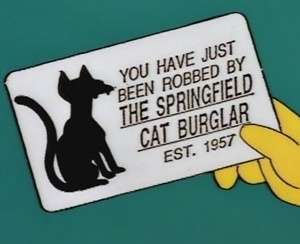 - In "Homer the Vigilante" the mystery thief leaves a card behind at each crime scene: "You have just been robbed by the Springfield Cat Burglar."