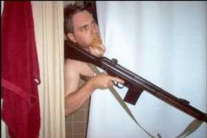 When a character is bathing and someone of the opposite sex comes in, or something is going to attack the bather, they suddenly pull out a gun while still in the tub and try to shoot the intruder. Or draw a blade and try stabbing him, if firearms aren't an option. Sibling trope to the Pillow Pistol. If they employ their towel as said weapon, that's Cloth Fu.