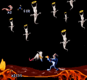 - The battle with Evil the Cat in the first Earthworm Jim game plays this trope to the hilt. Every time he's shot, a numbered ghost flies away, and after the ninth time, the battle ends.