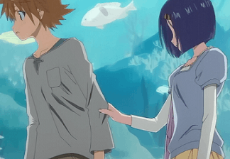 In many an Anime, The Protagonist (usually male) is left alone in a romantically charged situation with a Love Interest (usually female). When this happens, an awkward silence usually ensues, followed by the guy suggesting some banal activity to fill the time. He takes a step, only for the girl to grab his shirt sleeve, stopping him in his tracks. Indeed, we will often be treated to a several second pan over the motionless duo. The girl's eyes will likely be hidden as well. This often heralds a plot-significant, romantically related conversation.