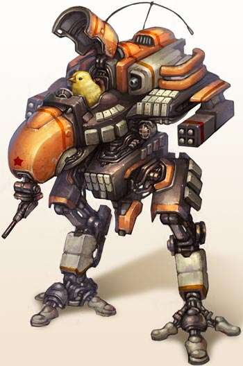 Most of the time a Chicken Walker is a Humongous Mecha or Mini-Mecha but occasionally backwards bending legs pop up on cabins or other objects as well. While there may be some benefits to a leg shaped like this, it doesn't overcome the fact that these are inherently funny (though you'll find most, if not all military-themed series will be taking them very seriously).