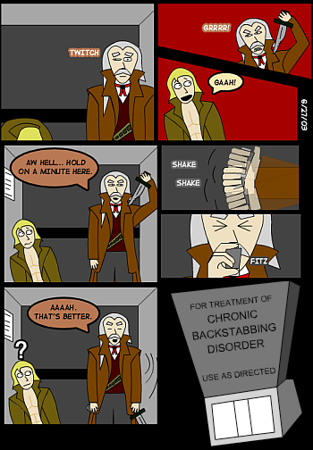 - In Sluggy Freelance, Dr. Schlock switches between helping the main characters, helping Hereti Corp, and just looking out for himself over half a dozen times. It gets to the point where Riff insists that Schlock roleplay betraying the gang, just to get it out of his system.