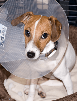 In veterinary practice, the Elizabethan Collar (known colloquially as a 'cone') has the purpose of promoting healing of a wound by preventing the animal from messing with it. It's effective enough. However, there is one big problem with this device...