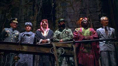 Options include both sexes (but usually just one woman), ethnically, religiously and geographically distinct people, always in the regional chic rather than western business attire (except maybe one). A comedy can even highlight this by using ridiculously cliché or period dress, such as the Mexican delegate dressing like 1910 Bandito/Revolutionaries, the Russians contingent in full Cossack regalia, or an American in a cowboy suit. If they aren't outlandish/foreign enough, expect them to layer their English with lots of gratuitous phrases or accents.