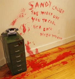 See Also: Distress Call, Room Full of Crazy and Deal with the Devil; all of which use or overlap with this trope to some extent. There may be Bloody Handprints nearby as well.