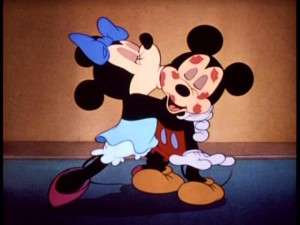 - Happens a lot in the classic Disney cartoons, most frequently with Minnie covering Mickey in kisses (an instance of this in "The Brave Little Tailor" has become quite famous; another instance, the Nabisco commercial "Mickey's Surprise Party", is pictured above), and occasionally Daisy kissing Donald. It becomes a sight gag at the end of "Donald Steps Out," where one of Daisy's kisses lands on Donald's eye, and as he blinks it evokes the image of lips smacking.