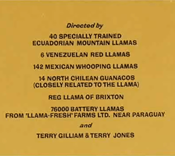 - The credits for Monty Python and the Holy Grail begin with dark, dramatic, epic-style music... then faux-Swedish subtitles start showing up, interspersed by notices that first state the people responsible for the fault in the subtitles had been "sacked", then that the people who were supposed to sack those responsible for the fault in subtitles were also sacked. Things become slightly more sensical...until credits revolving around moose start appearing. Eventually, we are told "The directors of the firm hired to continue the credits after the other people had been sacked, wish it to be known that they have just been sacked." Then the credits begin flashing in seizure-inducing colors, while credits related to llamas start appearing and Mexican music plays in the background. All this nonsense, and the movie hasn't started yet.