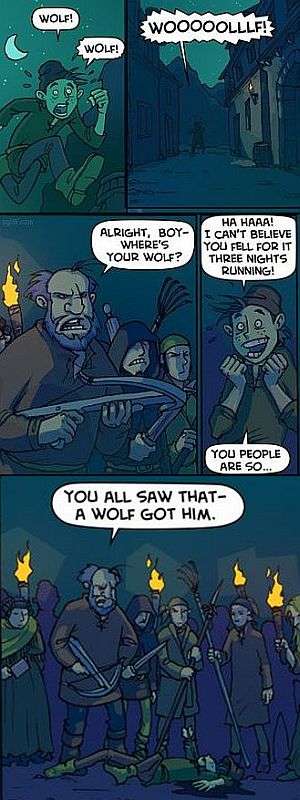You know the story. A little shepherd boy cries wolf to get people to come running, because he's bored out of his skull (or whatever). They fall for it. He does it again. They fall for it again. Then, an actual wolf comes along, and the little boy screams his little lungs out (crying "You Have to Believe Me!") but this time nobody comes, since they think he's just playing that stupid prank again. Why Didn't You Just Say So? may then ensue. Grimmer versions will end with the wolf eating the boy. Or the sheep. Or everyone.