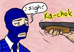 - You Always Hear the Bullet: There's usually a sound effect whenever a gun is fired. However, when Red shoves Sniper out of the way of a bullet, the reader doesn't realize anything's wrong until...