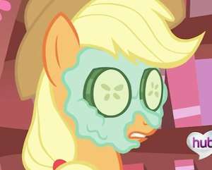 - When Twilight, as part of her by-the-book slumber party plans, decides they should give each other makeovers, it involves this. Notably, Rarity actually explains correctly what the cucumbers are for. Applejack just eats hers ("Puffiness, schmuffiness!"). (Gets a call-back later when Rarity ends up covered in real mud and AJ, thinking quickly, sticks a pair of cucumber slices on her eyes to make her feel better).