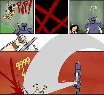 Fast forward a week and you've got the next episode. Wait, something's wrong here. Bob is predicting Evulz's moves to the inch, hitting him with every move in his own arsenal, and not even getting tired whilst doing so! By the end of the episode, Evulz is stone dead, and Bob hasn't a drop of blood on him except for Evulz's. He wipes off the sword, sheathes it, says something about his sister, and walks into the sunset. Evulz has just been subjected to a Curb Stomp Battle.
